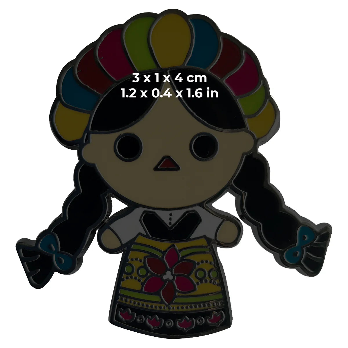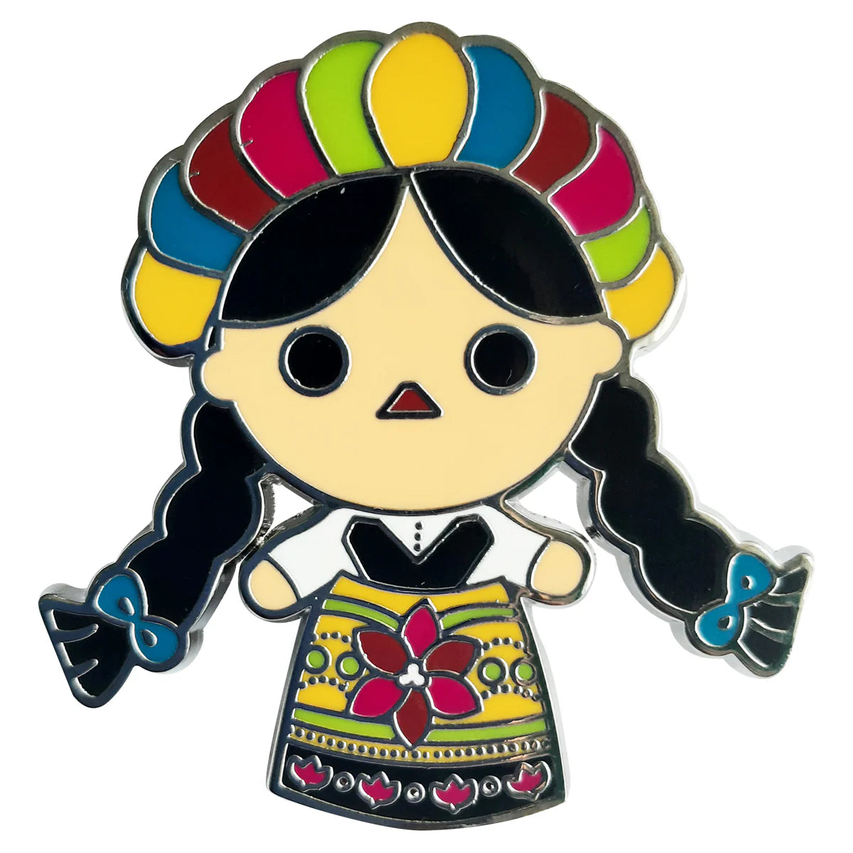 Este pin metálico de By México presenta una adorable muñeca artesanal, con su vestimenta típica llena de color.