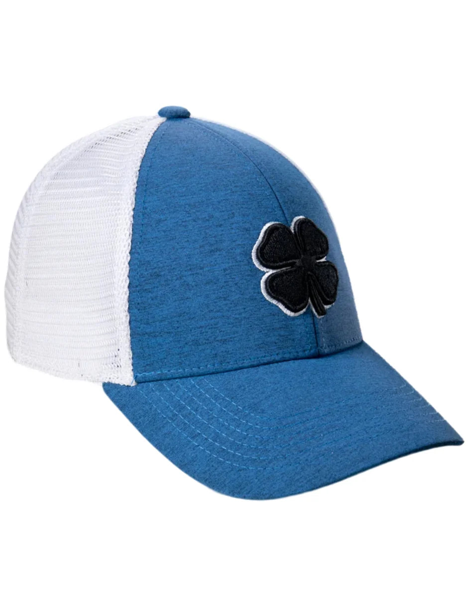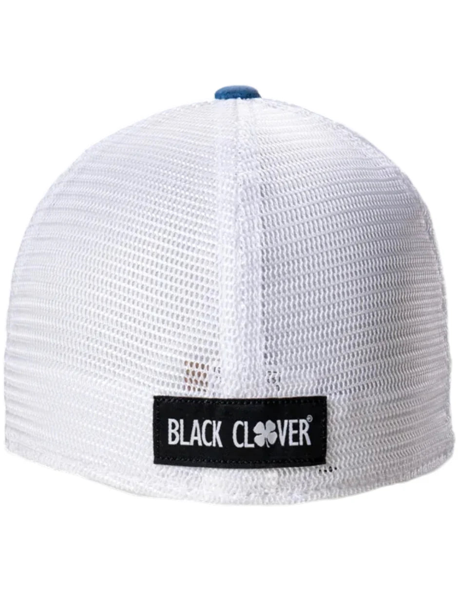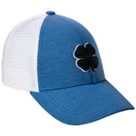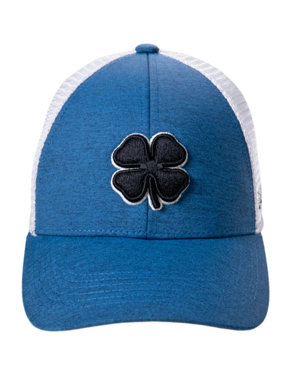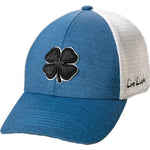 ⦿ Diseño: Trébol de cuatro hojas en color negro con borde blanco bordado sobre el panel frontal de un tono azul jaspeado. La frase "Live Lucky" está bordada discretamente en el lateral.