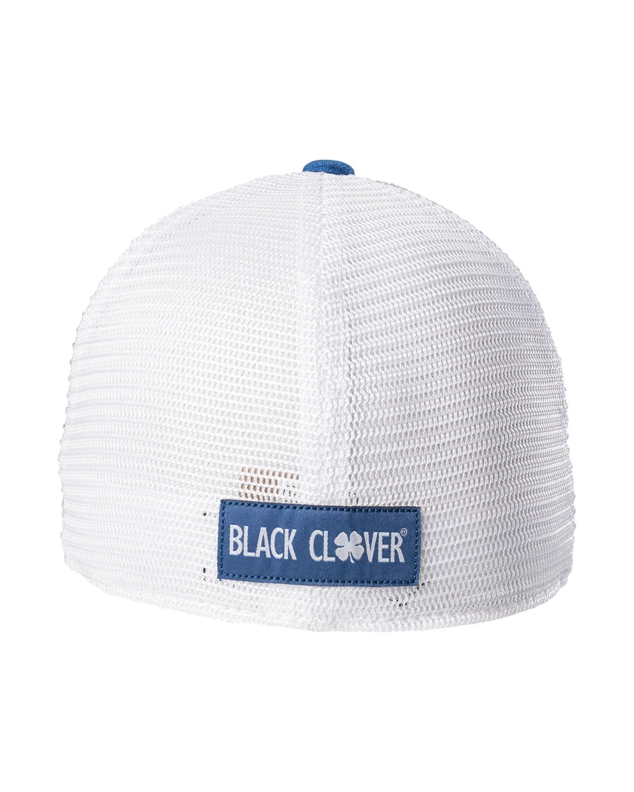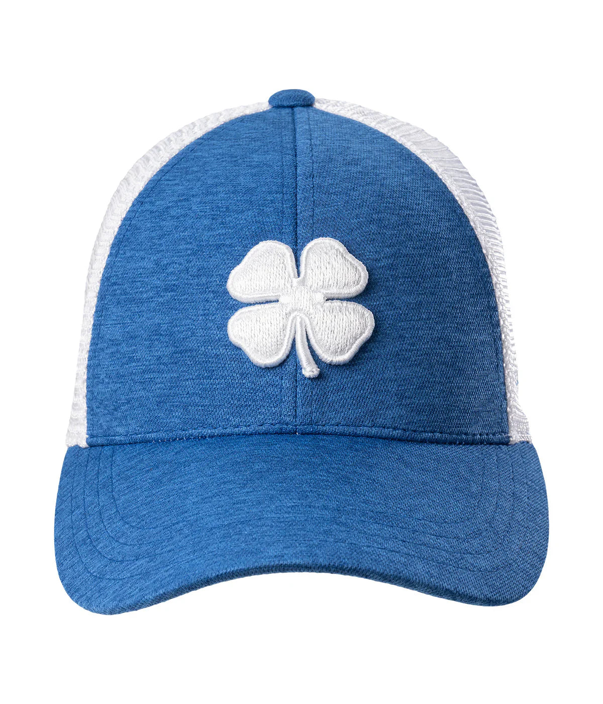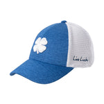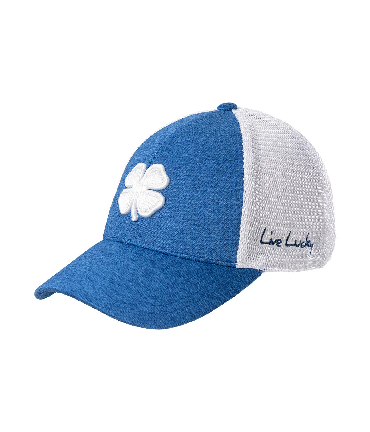 ⦿ Diseño: Trébol de cuatro hojas en color blanco bordado sobre el panel frontal de un tono azul jaspeado. La frase "Live Lucky" está bordada discretamente en el lateral.