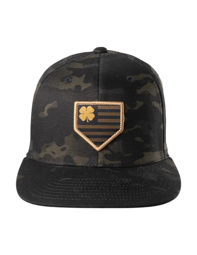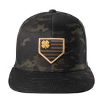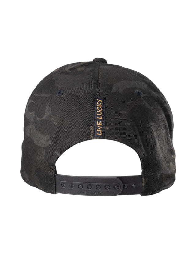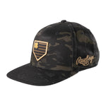 ⦿ Detalles: Diseño en camuflaje oscuro con un parche frontal en forma de "home plate" que luce un trébol de cuatro hojas. Logotipo "Rawlings" bordado en hilo dorado en el lateral.