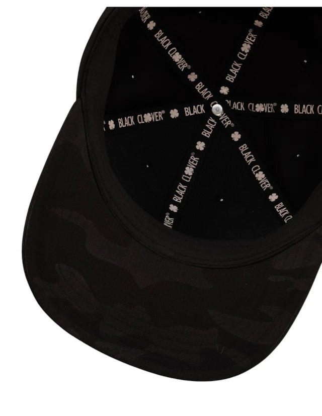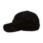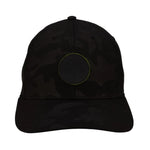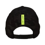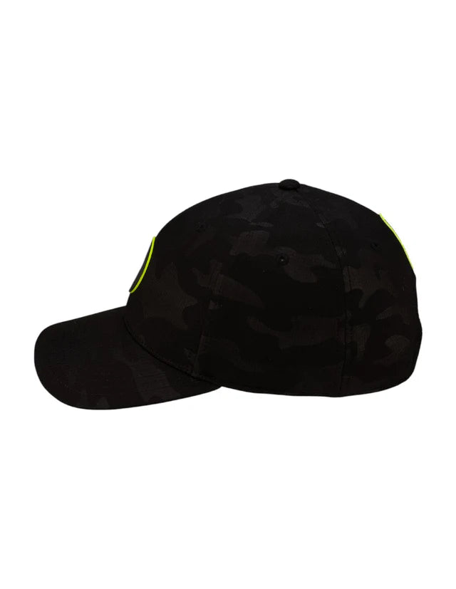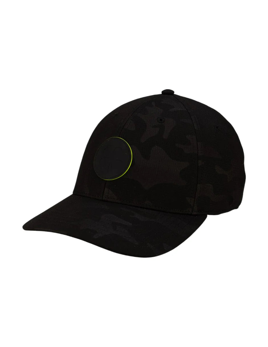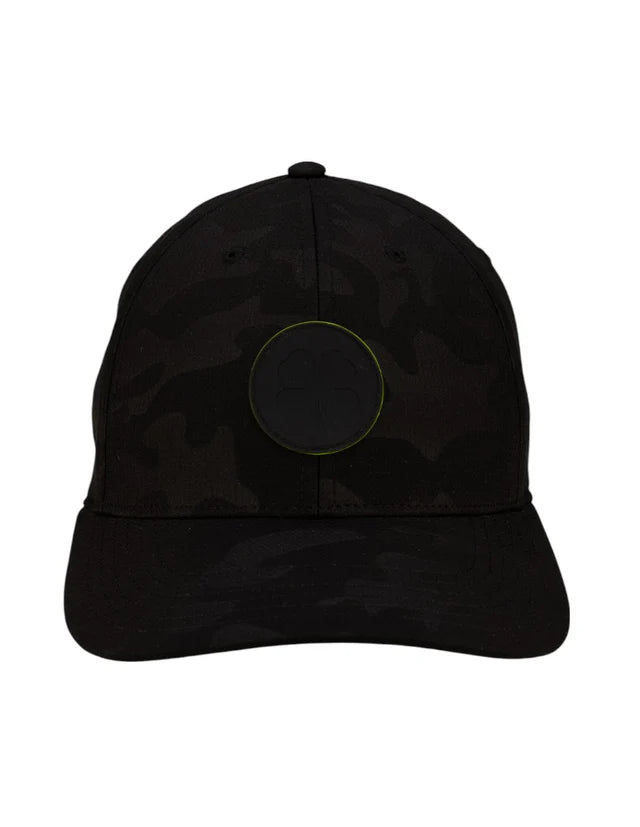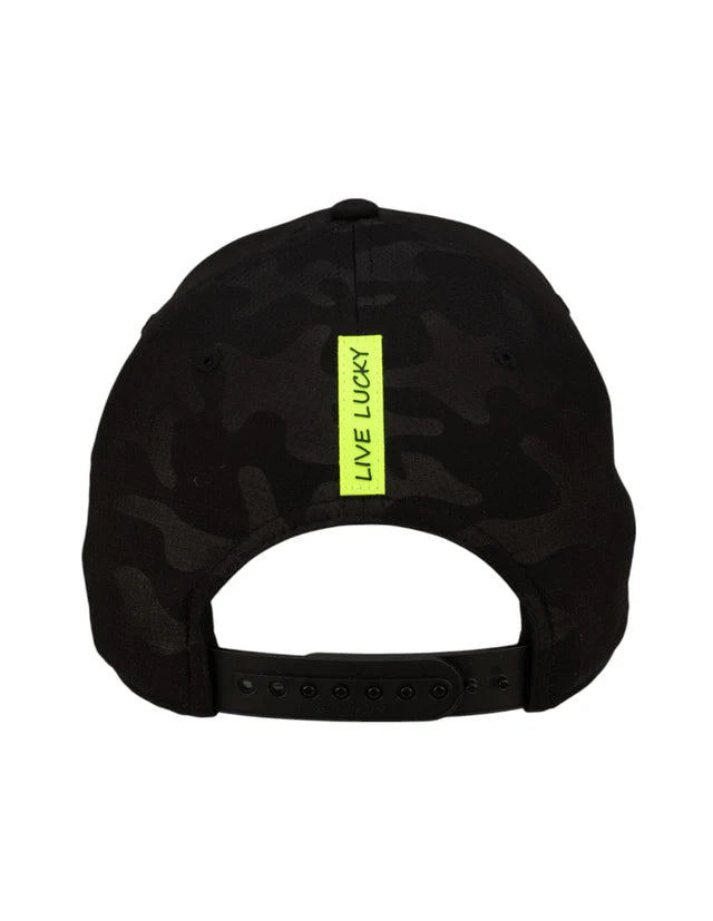 ⦿ Detalles: Diseño en un patrón de camuflaje oscuro. Presenta un parche circular de goma en el frontal con un trébol tonal, resaltado por un borde fino en color verde neón.