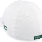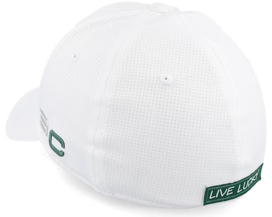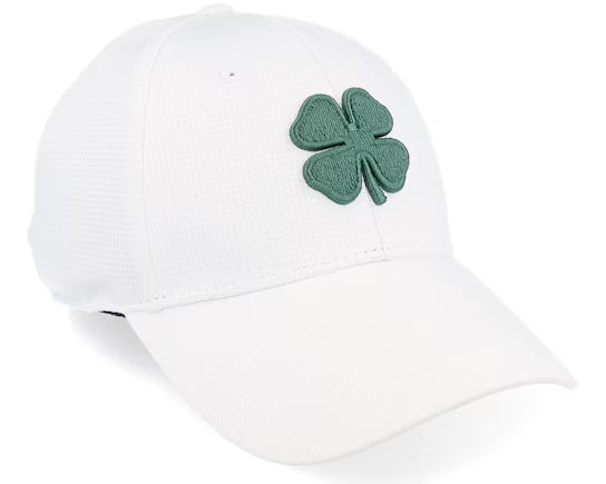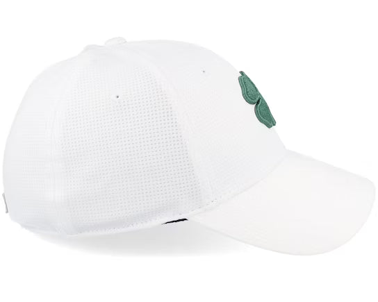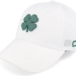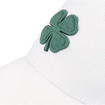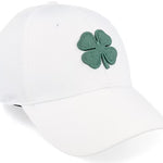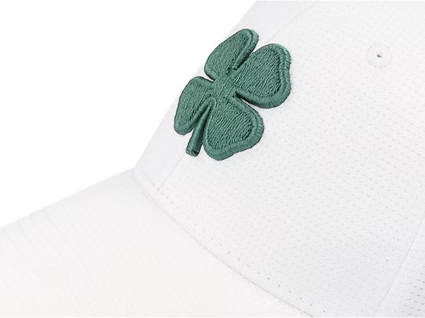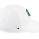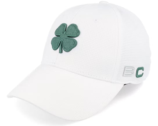 ⦿ Diseño: Trébol de cuatro hojas bordado en color verde con efecto 3D sobre la gorra completamente blanca. El logo "BC" en el lateral está bordado en un tono gris sutil.