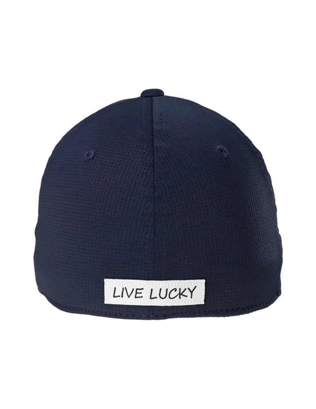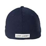 ⦿ Detalles: Diseño en color azul marino, con un patrón de cuadrícula sutil y un trébol de cuatro hojas en blanco bordado.