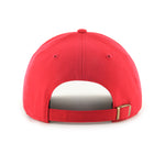 ⦿ Tipo de Gorra: Gorra roja con visera curva, cierre de tela ajustable en la parte trasera y el logo de '47 bordado en blanco en el lateral.