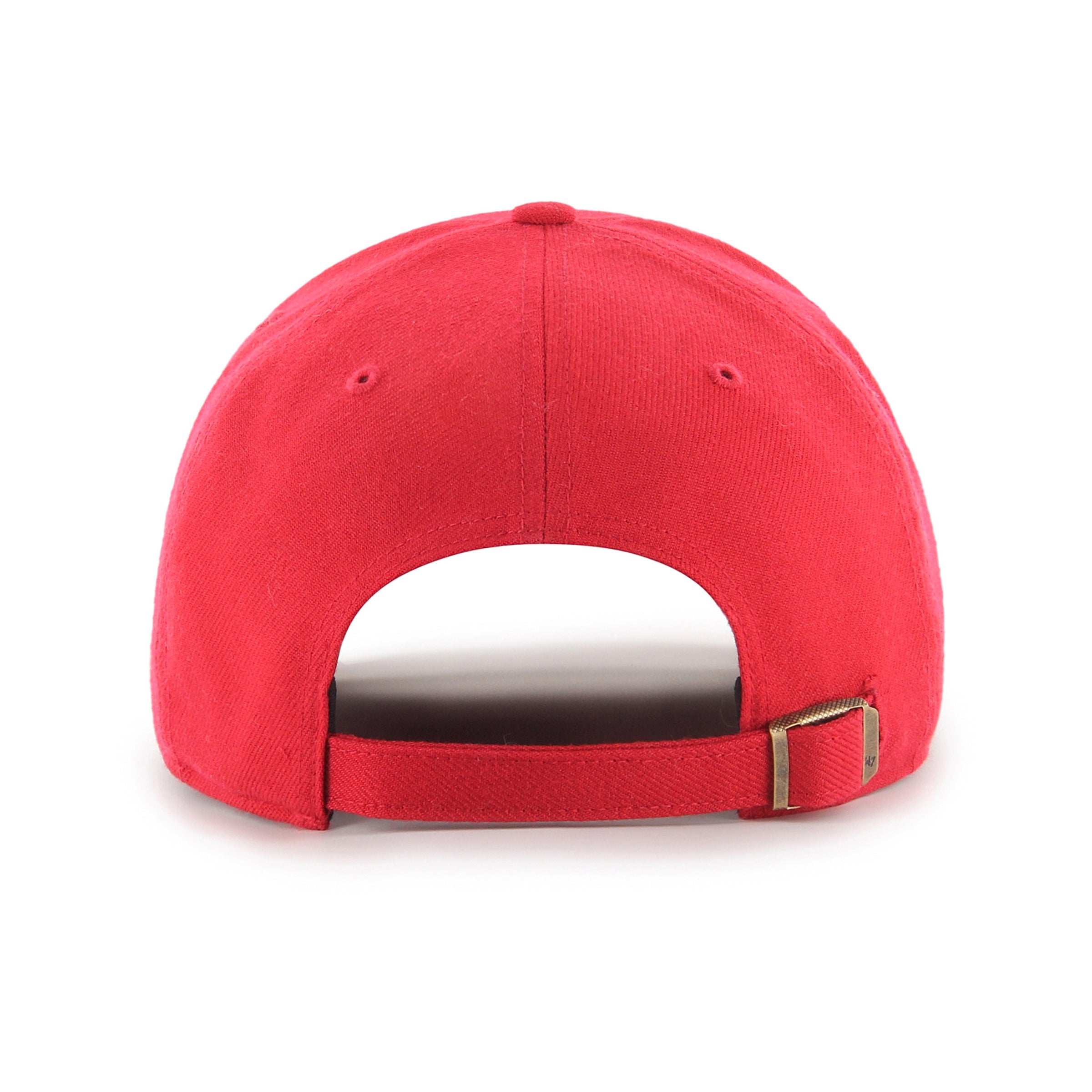 ⦿ Tipo de Gorra: Gorra roja con visera curva, cierre de tela ajustable en la parte trasera y el logo de '47 bordado en blanco en el lateral.
