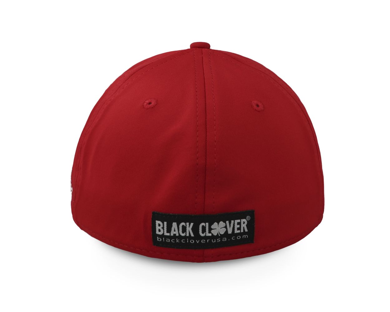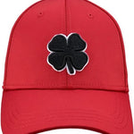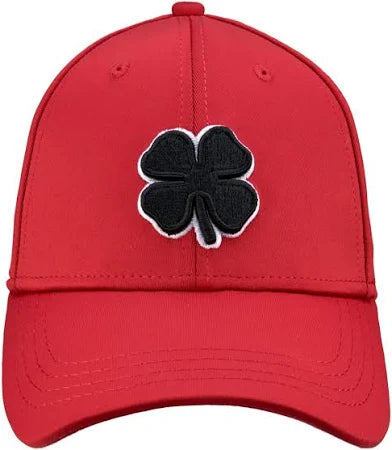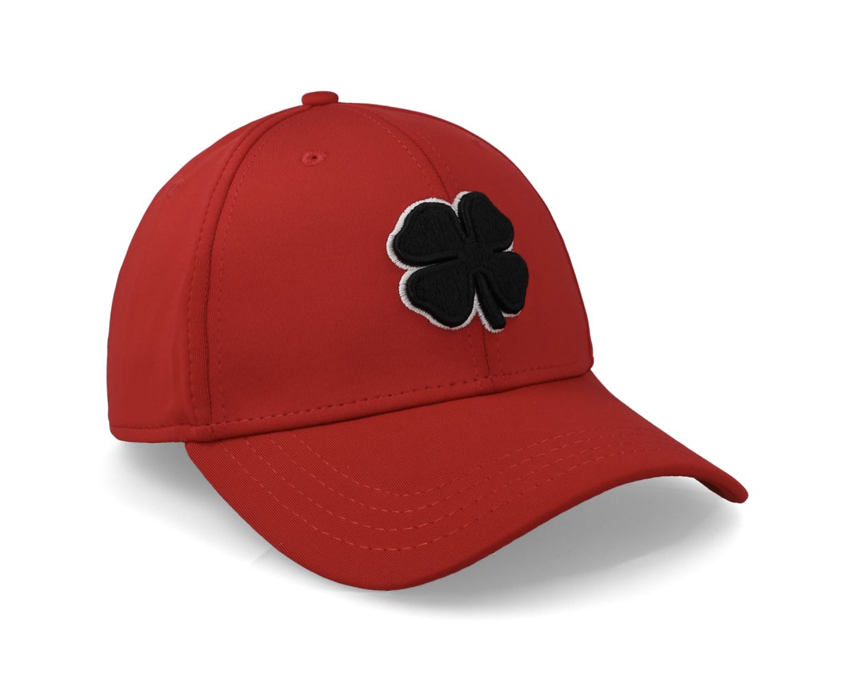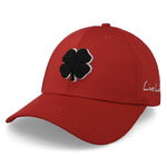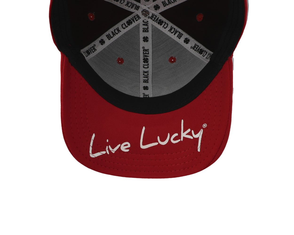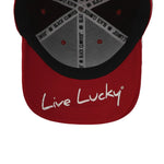⦿ Diseño: Trébol de cuatro hojas en color negro con borde blanco bordado sobre la gorra de color rojo. La frase "Live Lucky" está bordada en blanco en un costado, creando un contraste nítido.