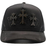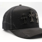 ⦿ Detalles: Diseño "all black" con aplicaciones frontales de triple cruz gótica en metal oscuro, todas incrustadas con pedrería negra. Un patrón de rosario en pedrería negra adorna el fondo.