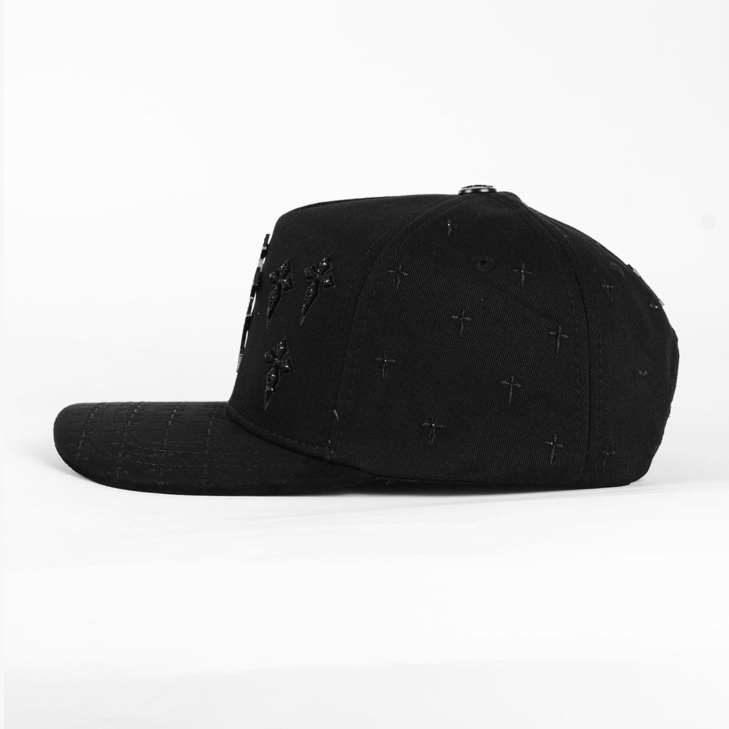 ⦿ Detalles: Gran cruz central de metal con incrustaciones de cristales negros en la parte frontal. El resto de la gorra está decorado con múltiples cruces bordadas en el mismo tono.