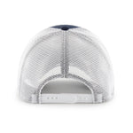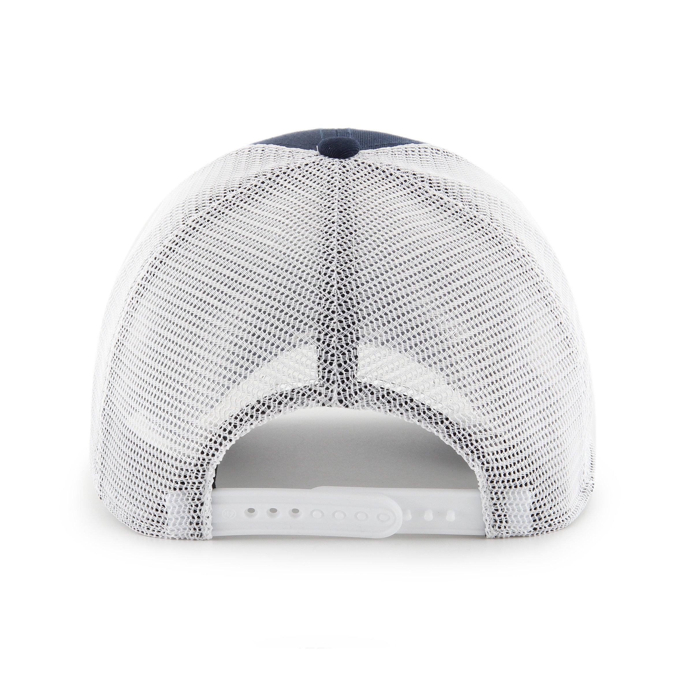 ⦿ Tipo: Gorra de visera curva con paneles traseros de malla en color blanco. Ajuste trasero de broche de plástico y logo de '47 bordado en azul marino.