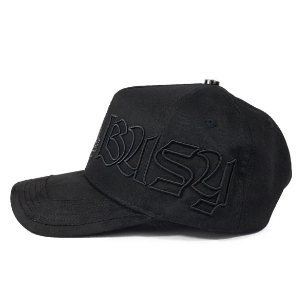 ⦿ Detalles: Frase "STAY BUSY" en 3D bordada al frente. En el centro tiene la figura de un hombre con un maletín, también bordada.