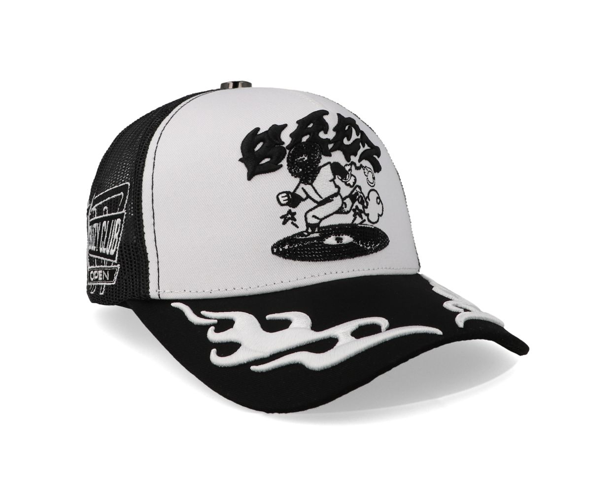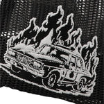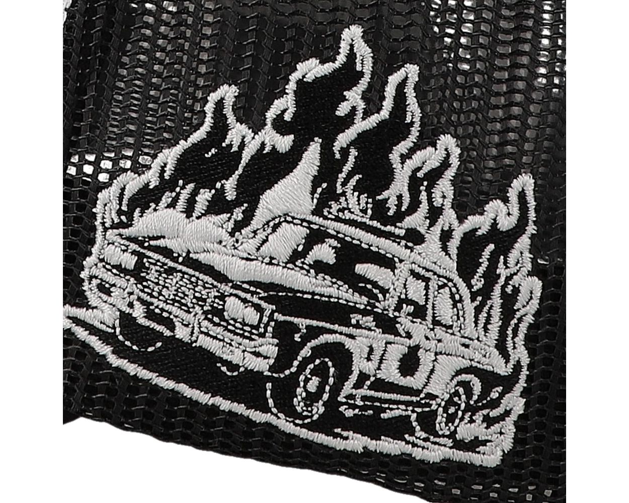 ⦿ Detalles: Bordado de un personaje de caricatura con flamas en la parte frontal. Bordado de flamas blancas en la visera y de un auto con personajes en el lateral derecho.
