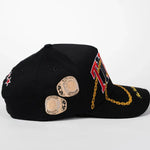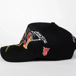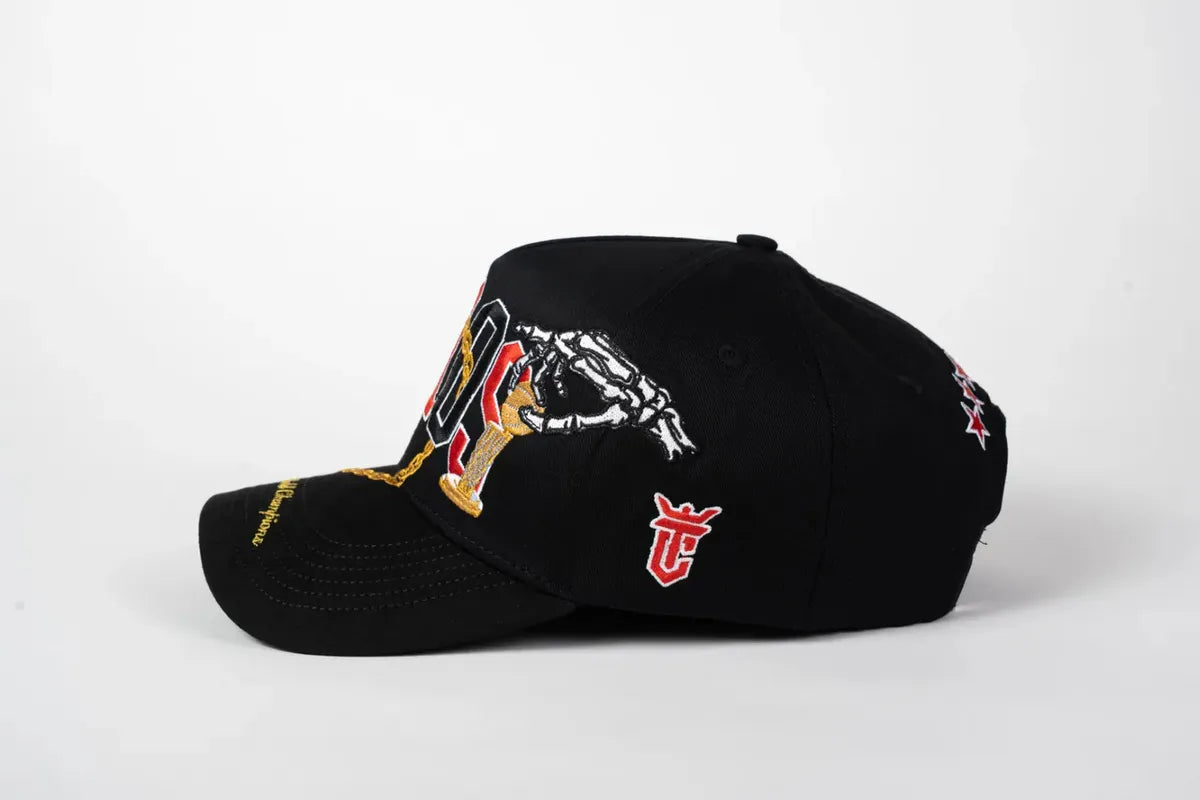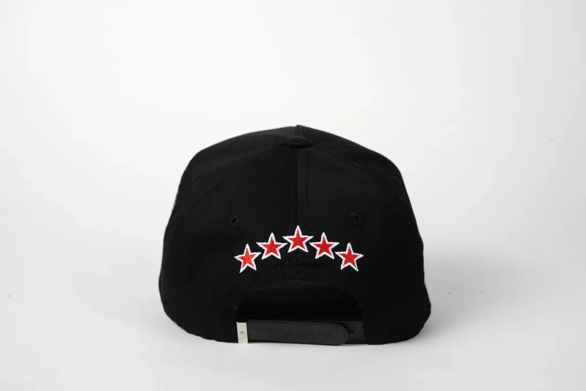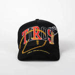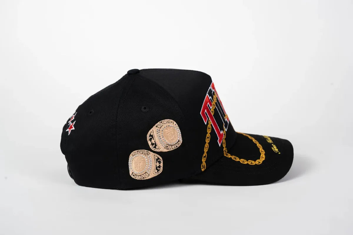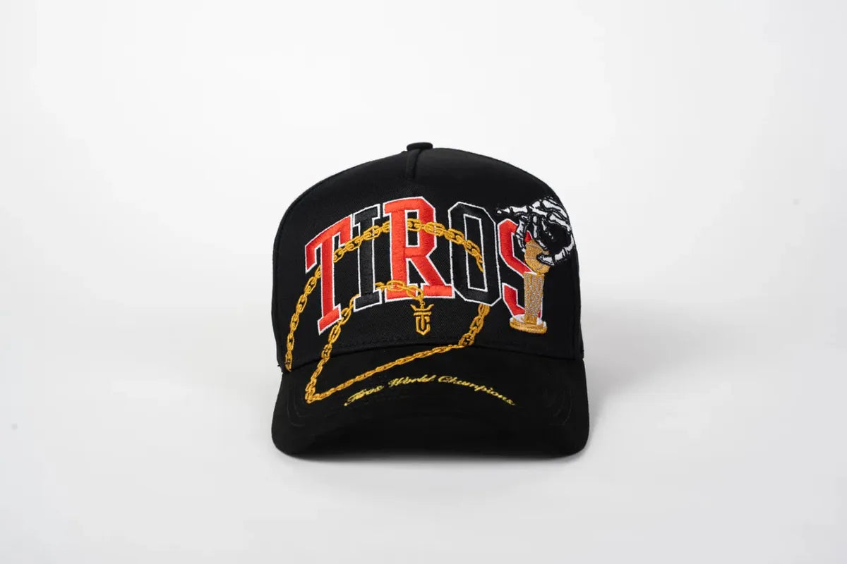 ⦿ Detalles: Bordado frontal "TIROS" en relieve 3D (rojo y blanco), entrelazado con una cadena dorada. Detalle lateral de garra sosteniendo un trofeo de campeonato y logo "TC" coronado al centro.