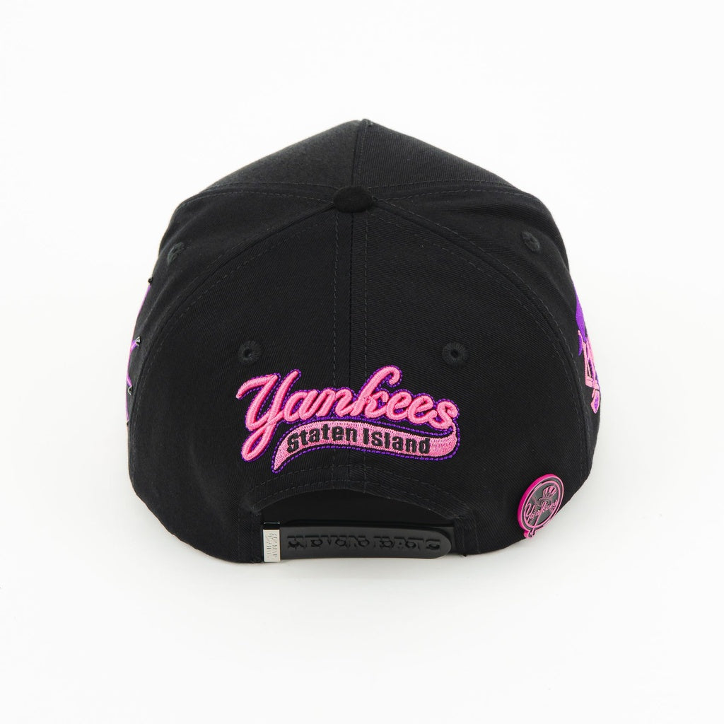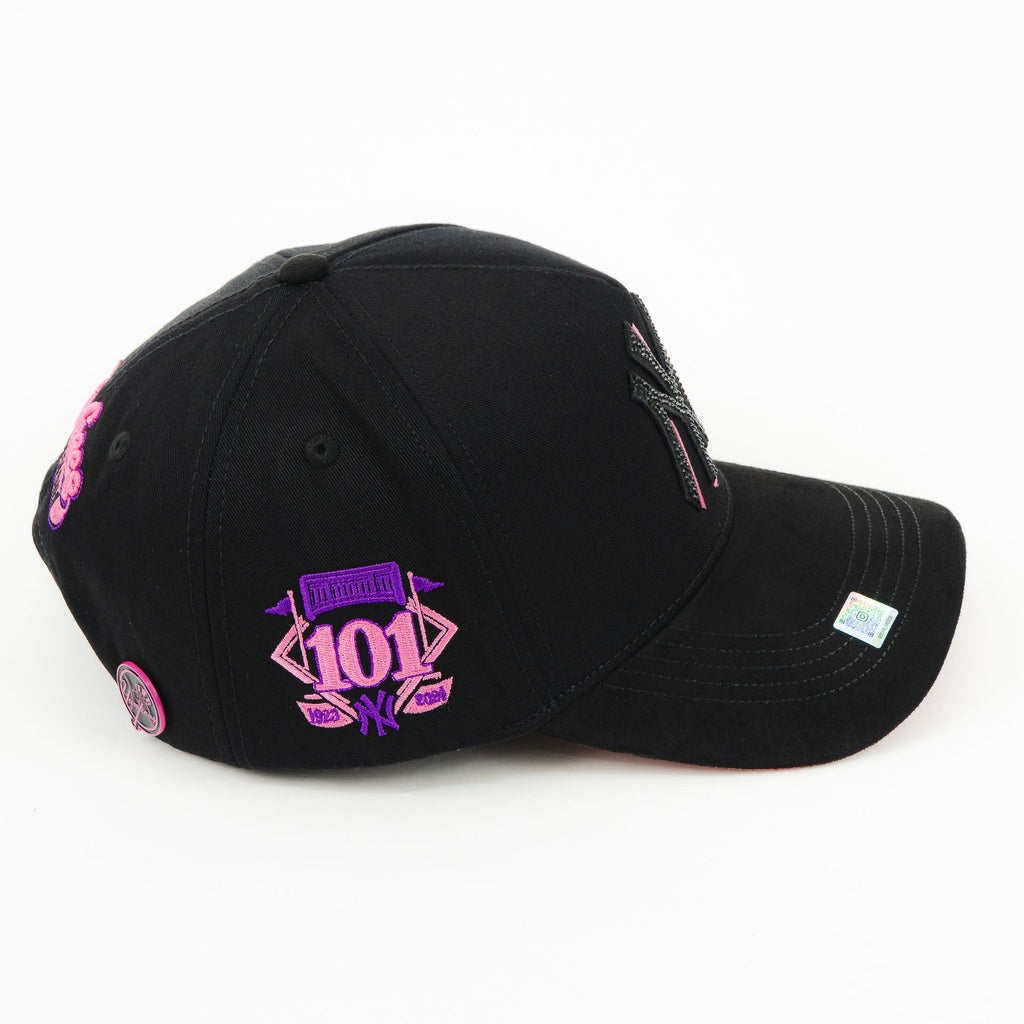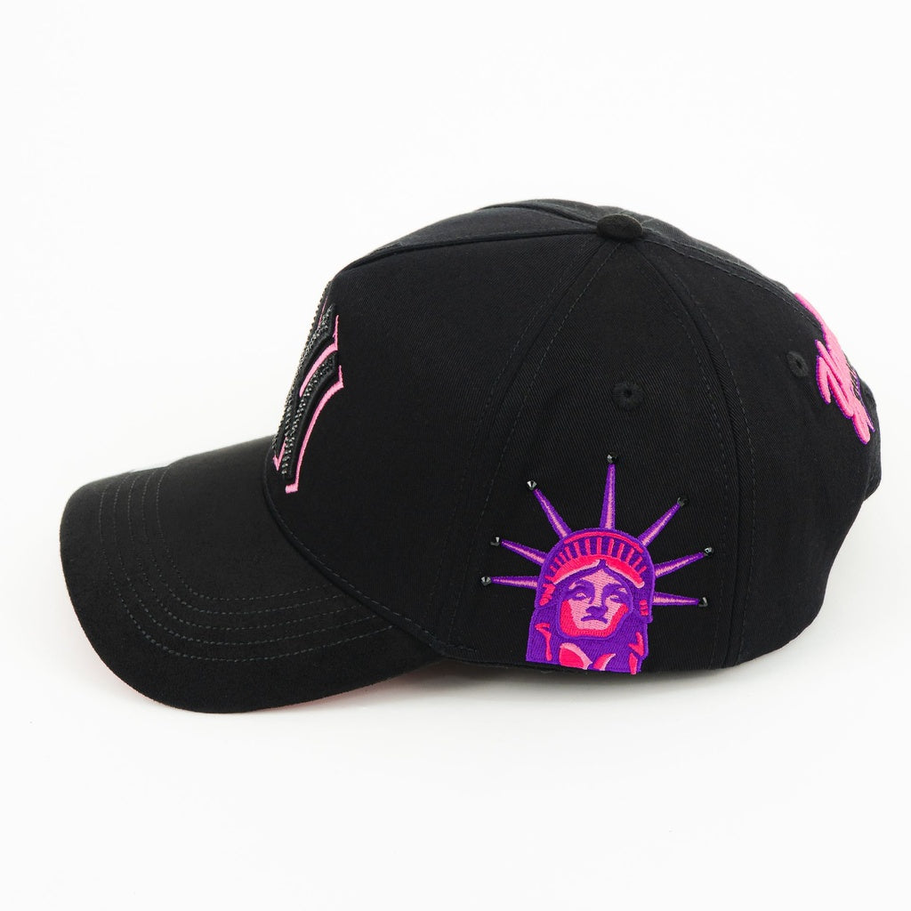 ⦿ Detalles: Logo "NY" en la parte frontal, con bordado en color negro y el interior en rosa brillante, además de aplicaciones de cristales. En el lateral izquierdo, cuenta con un bordado de un trofeo y un estandarte en tonos morados y rosas.